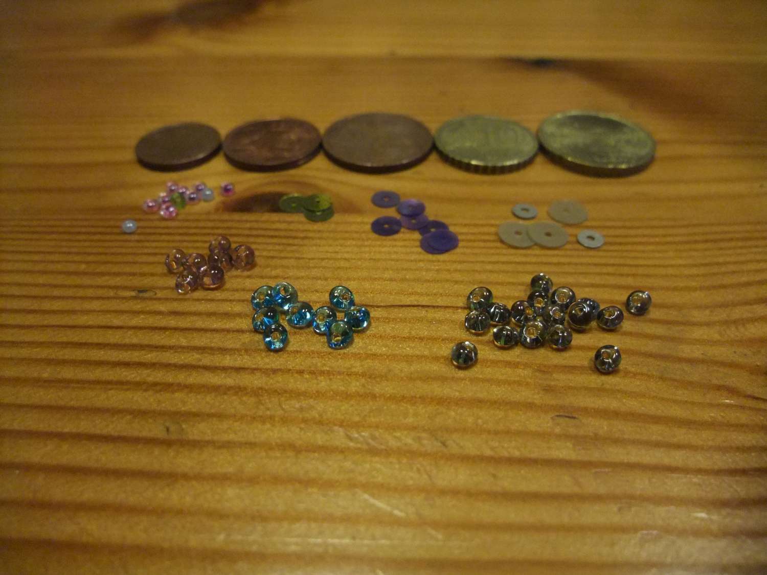 Aquí se puden ver las rocallas de tamaño normal a la izquierda. Y esas rosadas son muy monas.En el tema lentejuelas me gustan planas, nada de festoneadas. No muy grandes, de unos 5 mm, y preferiblemente de colores alegres y metálicos y con cierto punto transparente. Me gustaría tener en rojo, en azules, en plateado (si las hubiera), naranjas...